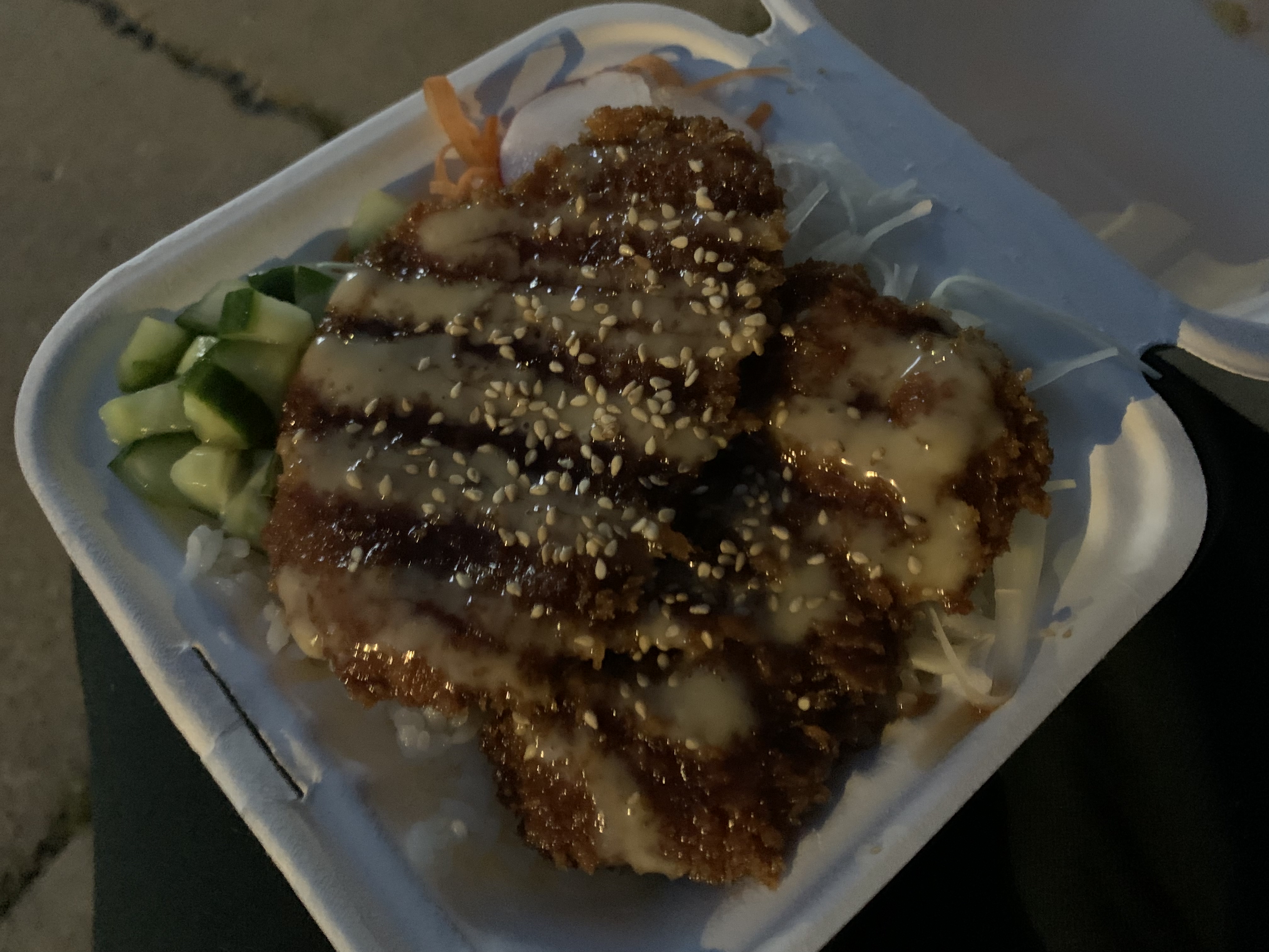 돈카츠는 빵가루에 튀긴 돼지 안심(일본식 슈니첼)을 일본식 우스터 돈카츠 소스와 허니머스타드 소스, 채소, 양배추, 당근, 옥수수, 무, 참깨, 드레싱과 함께 먹는 요리입니다. (Deep fried breaded pork tender loin(Japanese schnitzel) dip in Japanese Worcester Tonkatsu sauce with honey mustard drizzle, greens, cabbage, carrot, corn, radish, sesame seeds and dressing.)