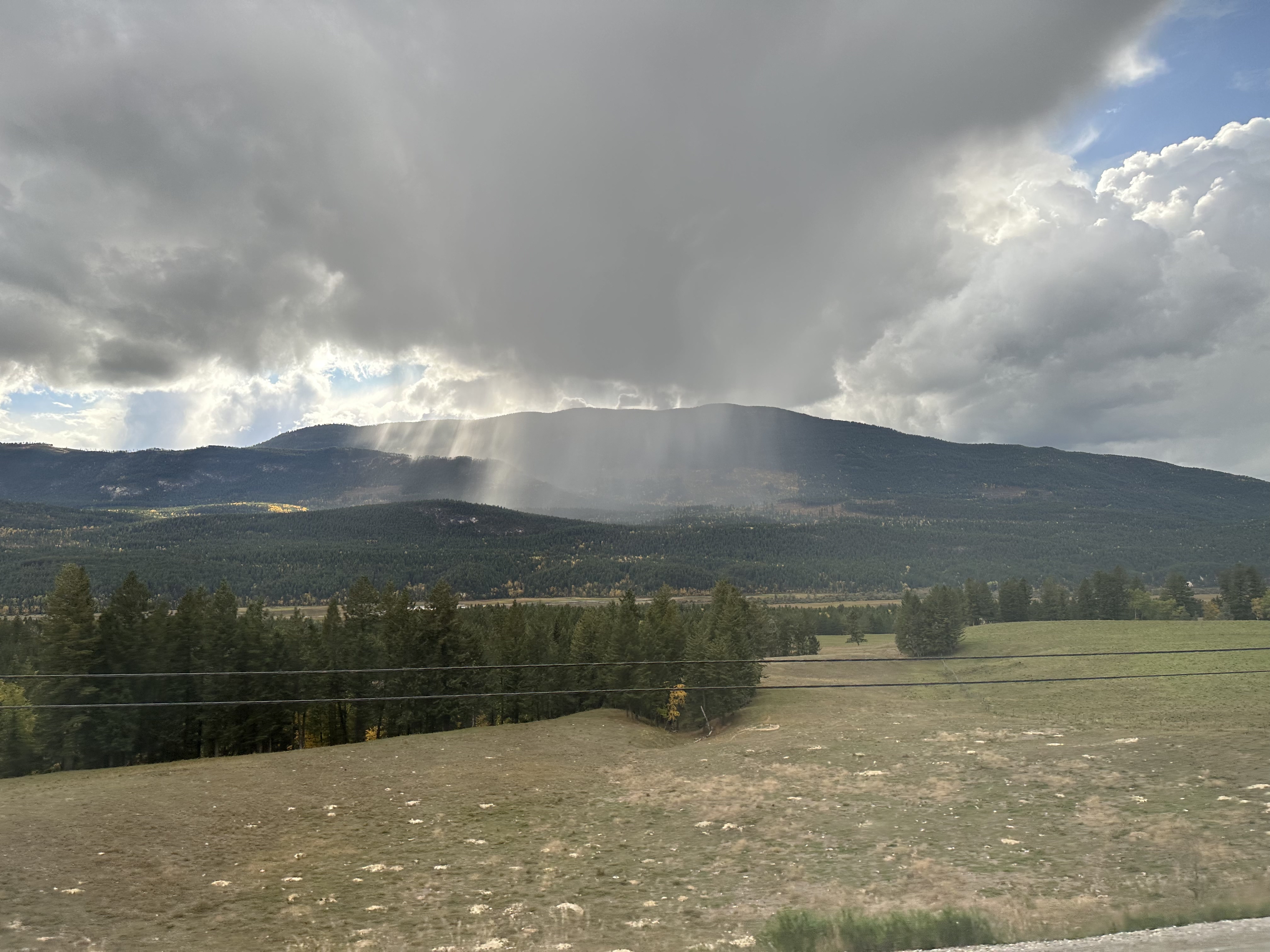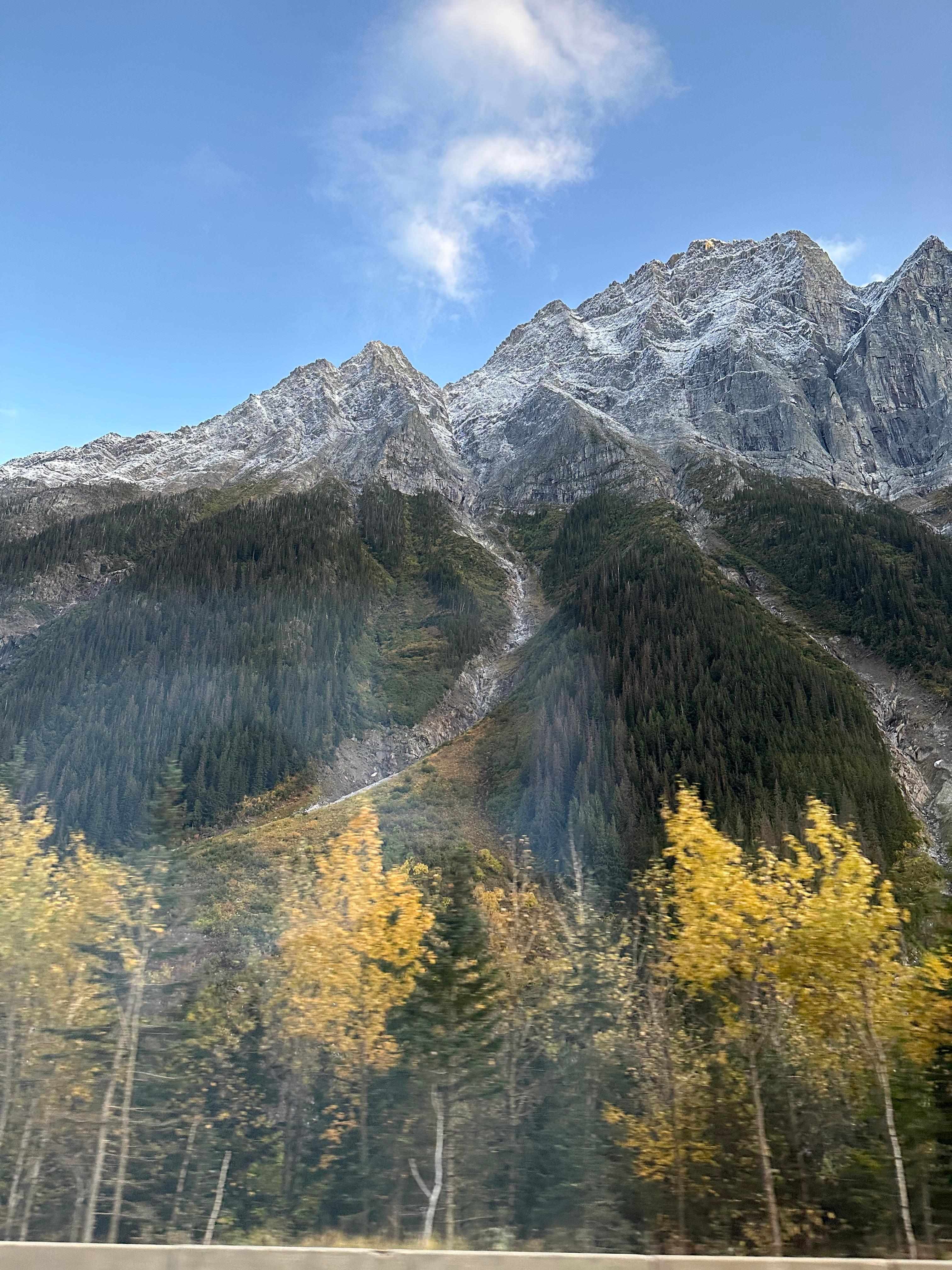 버스 안에서 본 국지성 호우(?)도 너무 신기해서 사진으로 찍어보았습니다. 저 회색 줄이 있는 곳에만 엄청난 비가 쏟아지고 있는 것. 로키 투어를 하다 보면 이런 자연 현상이나 동물들을 심심치 않게 보게 되는 건가 봐요. 가파른 산맥 틈도 멋있어서 찍어보았습니다. 지나가는 자연 풍경 하나하나가 참 재미있고 신비롭게 느껴졌습니다.